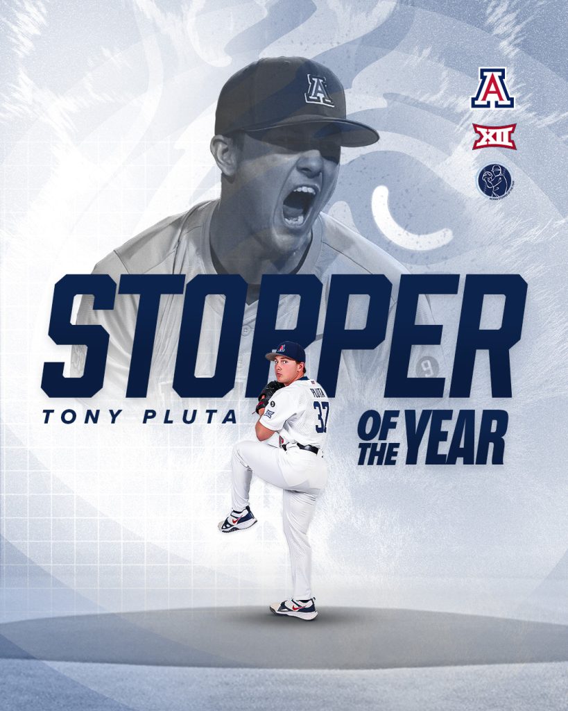 Arizona ace closer Tony Pluta was named on Friday the National Collegiate Baseball Writers Association (NCBWA) Stopper of the Year for 2025.