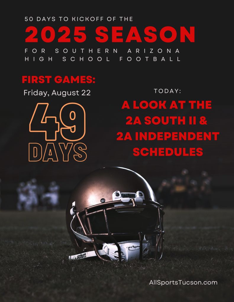 ALLSPORTSTUCSON.COM CONTINUES ITS 50 POSTS FOR THE 50-DAY COUNTDOWN TO THE 2025 SEASON THAT STARTS AUG. 22 FOR SOME SCHOOLS WITH A LOOK AT THE 2A SOUTH II AND INDEPENDENT SCHEDULES. CATCH UP WITH ALL THE POSTS BY CLICKING HERE.