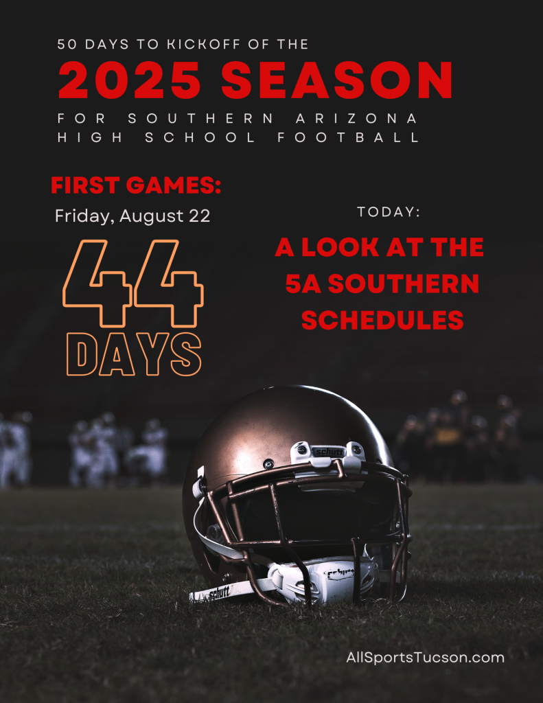 ALLSPORTSTUCSON.COM CONTINUES ITS 50 POSTS FOR THE 50-DAY COUNTDOWN TO THE 2025 SEASON THAT STARTS AUG. 22 FOR SOME SCHOOLS WITH A LOOK AT THE 5A SOUTHERN SCHEDULES. CATCH UP WITH ALL THE POSTS BY CLICKING HERE.