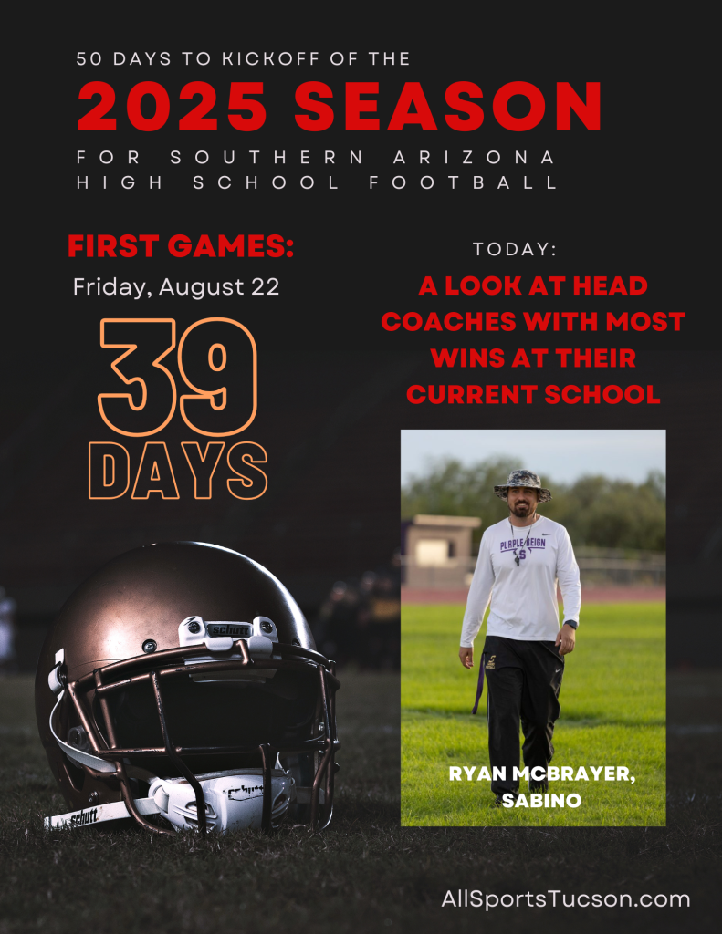 ALLSPORTSTUCSON.COM CONTINUES ITS 50 POSTS FOR THE 50-DAY COUNTDOWN TO THE 2025 SEASON THAT STARTS AUG. 22 FOR SOME SCHOOLS WITH A LOOK AT COACHES WITH THE MOST WINS AT THEIR CURRENT SCHOOL. CATCH UP WITH ALL THE POSTS BY CLICKING HERE.