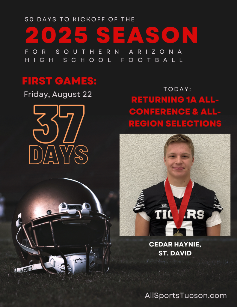 ALLSPORTSTUCSON.COM CONTINUES ITS 50 POSTS FOR THE 50-DAY COUNTDOWN TO THE 2025 SEASON THAT STARTS AUG. 22 FOR SOME SCHOOLS WITH A LOOK AT THE RETURNING SOUTHERN ARIZONA 1A ALL-CONFERENCE AND ALL-REGION PICKS AS SELECTED BY COACHES LAST YEAR. CATCH UP WITH ALL THE POSTS BY CLICKING HERE.