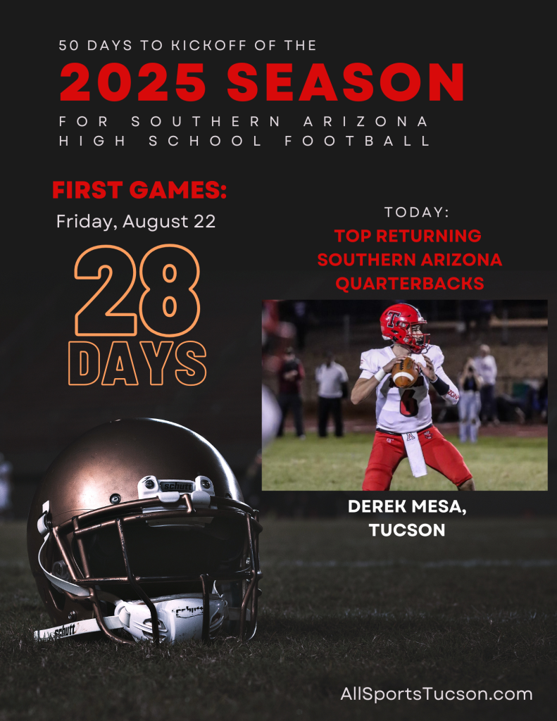 ALLSPORTSTUCSON.COM CONTINUES ITS 50 POSTS FOR THE 50-DAY COUNTDOWN TO THE 2025 SEASON THAT STARTS AUG. 22 FOR SOME SCHOOLS WITH A LOOK AT THE TOP RETURNING QUARTERBACKS AS DETERMINED BY COACHES. CATCH UP WITH ALL THE POSTS BY CLICKING HERE.