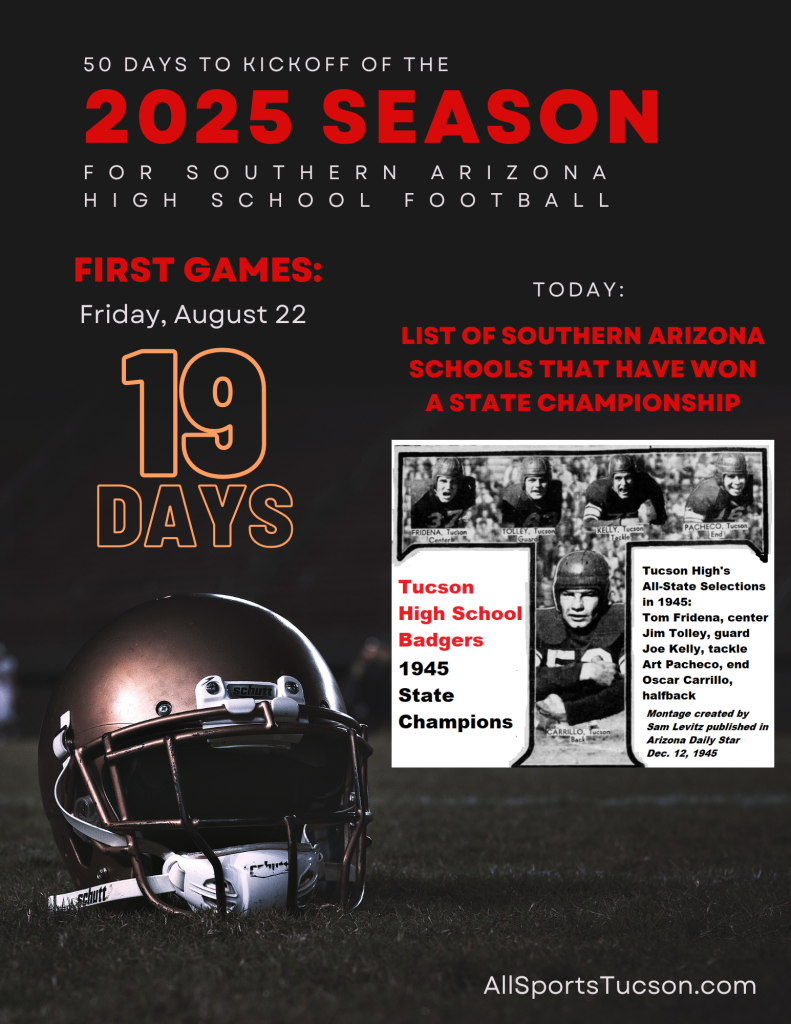 ALLSPORTSTUCSON.COM CONTINUES ITS 50 POSTS FOR THE 50-DAY COUNTDOWN TO THE 2025 SEASON THAT STARTS AUG. 22 FOR SOME SCHOOLS WITH A LOOK AT THE SOUTHERN ARIZONA SCHOOLS THAT HAVE WON A STATE CHAMPIONSHIP. CATCH UP WITH ALL THE POSTS BY CLICKING HERE.