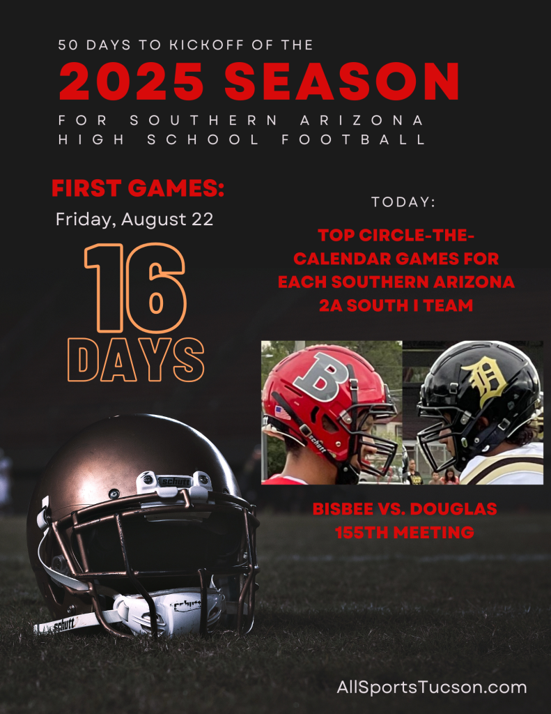 ALLSPORTSTUCSON.COM CONTINUES ITS 50 POSTS FOR THE 50-DAY COUNTDOWN TO THE 2025 SEASON THAT STARTS AUG. 22 FOR SOME SOUTHERN ARIZONA SCHOOLS WITH A LOOK AT THE TOP 2A SOUTH I GAMES TO WATCH THIS SEASON FOR EACH PROGRAM. CATCH UP WITH ALL THE POSTS BY CLICKING HERE.