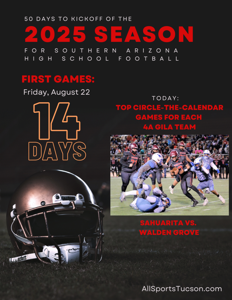 ALLSPORTSTUCSON.COM CONTINUES ITS 50 POSTS FOR THE 50-DAY COUNTDOWN TO THE 2025 SEASON THAT STARTS AUG. 22 FOR SOME SOUTHERN ARIZONA SCHOOLS WITH A LOOK AT THE TOP 4A GILA GAMES TO WATCH THIS SEASON FOR EACH PROGRAM. CATCH UP WITH ALL THE POSTS BY CLICKING HERE.