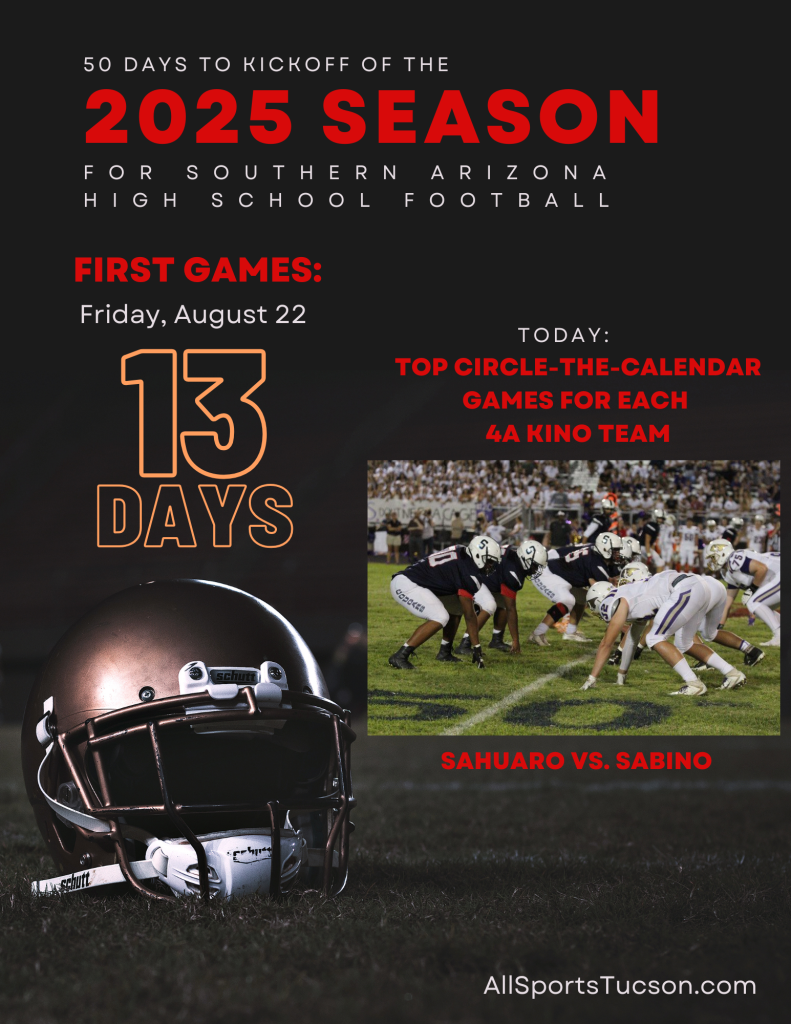ALLSPORTSTUCSON.COM CONTINUES ITS 50 POSTS FOR THE 50-DAY COUNTDOWN TO THE 2025 SEASON THAT STARTS AUG. 22 FOR SOME SOUTHERN ARIZONA SCHOOLS WITH A LOOK AT THE TOP 4A KINO GAMES TO WATCH THIS SEASON FOR EACH PROGRAM. CATCH UP WITH ALL THE POSTS BY CLICKING HERE.