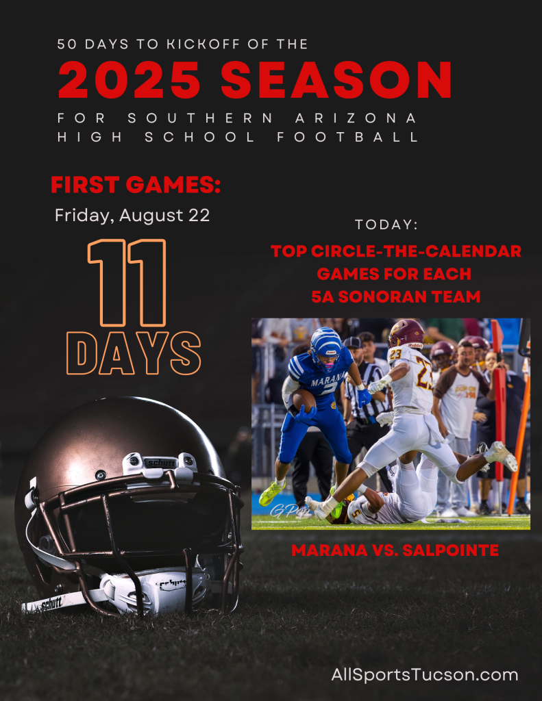 ALLSPORTSTUCSON.COM CONTINUES ITS 50 POSTS FOR THE 50-DAY COUNTDOWN TO THE 2025 SEASON THAT STARTS AUG. 22 FOR SOME SOUTHERN ARIZONA SCHOOLS WITH A LOOK AT THE TOP 5A SONORAN GAMES TO WATCH THIS SEASON FOR EACH PROGRAM. CATCH UP WITH ALL THE POSTS BY CLICKING HERE.