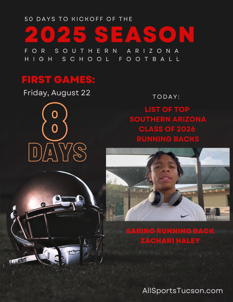 ALLSPORTSTUCSON.COM CONTINUES ITS 50 POSTS FOR THE 50-DAY COUNTDOWN TO THE 2025 SEASON THAT STARTS AUG. 22 FOR SOME SOUTHERN ARIZONA SCHOOLS WITH A LOOK AT A LIST OF TOP CLASS OF 2026 RUNNING BACKS. CATCH UP WITH ALL THE POSTS BY CLICKING HERE.