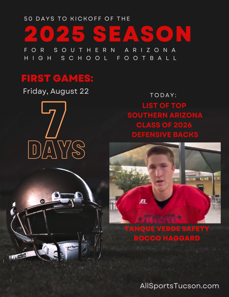 ALLSPORTSTUCSON.COM CONTINUES ITS 50 POSTS FOR THE 50-DAY COUNTDOWN TO THE 2025 SEASON THAT STARTS AUG. 22 FOR SOME SOUTHERN ARIZONA SCHOOLS WITH A LOOK AT A LIST OF TOP CLASS OF 2026 DEFENSIVE BACKS. CATCH UP WITH ALL THE POSTS BY CLICKING HERE.