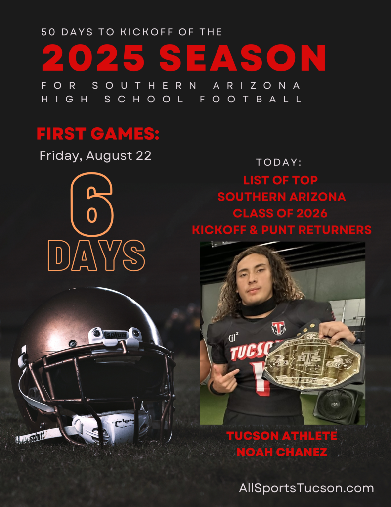 ALLSPORTSTUCSON.COM CONTINUES ITS 50 POSTS FOR THE 50-DAY COUNTDOWN TO THE 2025 SEASON THAT STARTS AUG. 22 FOR SOME SOUTHERN ARIZONA SCHOOLS WITH A LOOK AT A LIST OF TOP CLASS OF 2026 KICKOFF AND PUNT RETURNERS. CATCH UP WITH ALL THE POSTS BY CLICKING HERE.