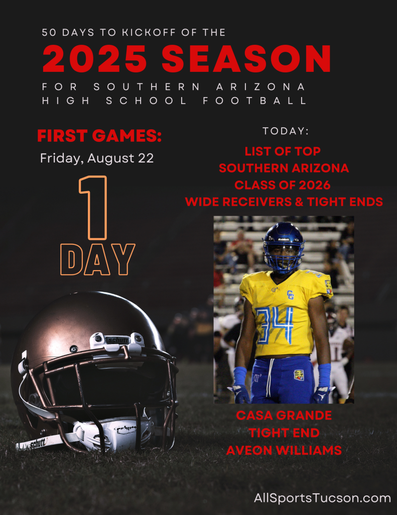 ALLSPORTSTUCSON.COM CONTINUES ITS 50 POSTS FOR THE 50-DAY COUNTDOWN TO THE 2025 SEASON THAT STARTS AUG. 22 FOR SOME SOUTHERN ARIZONA SCHOOLS WITH A LOOK AT A LIST OF TOP CLASS OF 2026 WIDE RECEIVERS AND TIGHT ENDS AS DETERMINED BY COACHES, NOT ALLSPORTSTUCSON.COM. CATCH UP WITH ALL THE POSTS BY CLICKING HERE.