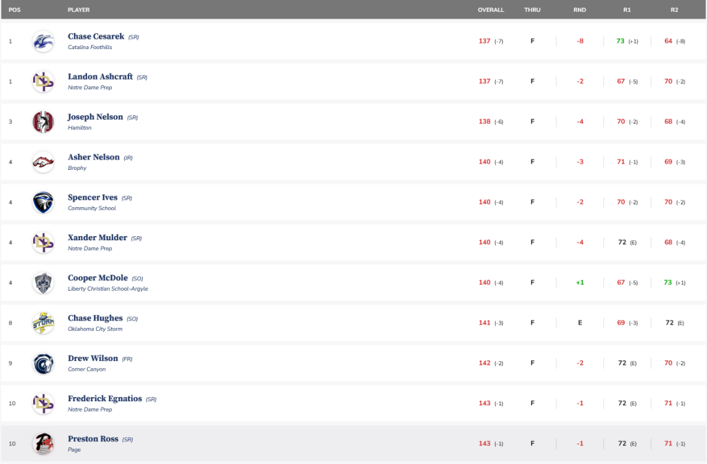 Cesarek committed to D-I Utah Tech two weeks ago and he helped lead the Falcons to a runner-up finish to Notre Dame last year at the D-II state tournament. Ashcraft helped lead Notre Dame to a 565-580 win over D-I Brophy at the Brophy Rodeo, an incredible 11-under team performance by the Saints. Brophy is the AIA D-I defending champion.