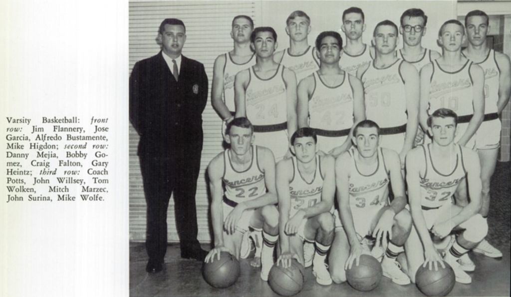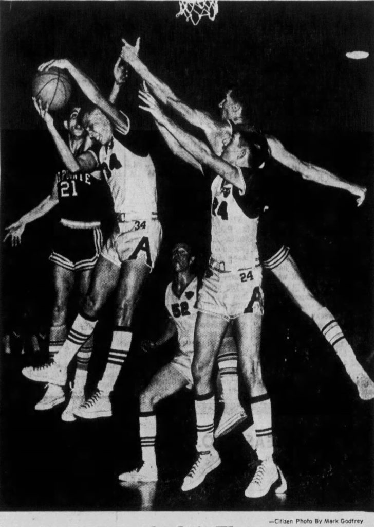 Jim Flannery going for a rebound under the basket in dark uniform. (Citizen Photo: 1965)