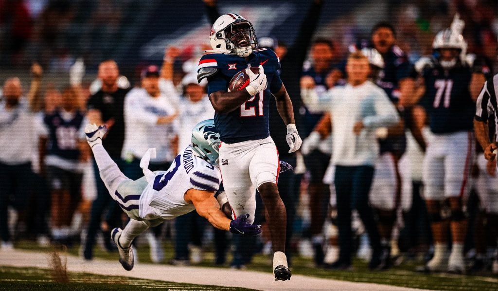 Noah Fifita finished with 178 passing yards on 16 completions and added two rushing touchdowns. Ismail Mahdi ran for 189 yards as Arizona outgained Kansas State 412-193.