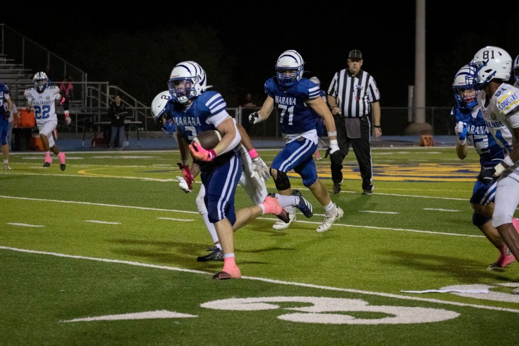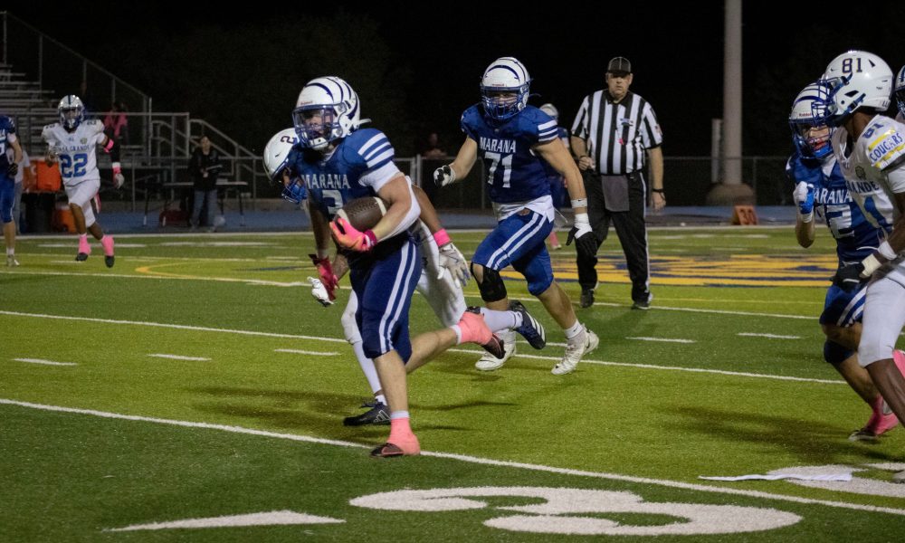 Friday night’s game had a different feel due to the Marana School District being on fall break. No band and a sparse crowd made Tiger Stadium uncharacteristically quiet, but that didn’t stop the team from playing hard in all phases for those in attendance.