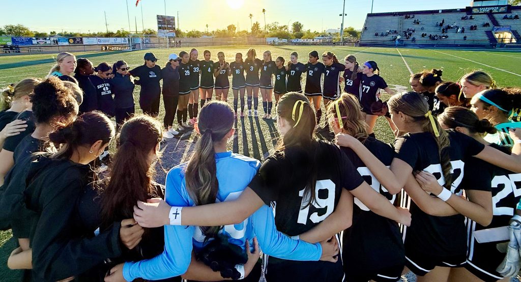 Jessica Rushton (in white hat) meets with her team before her first victory as the new head coach. (Andy Morales/AllSportsTucson)