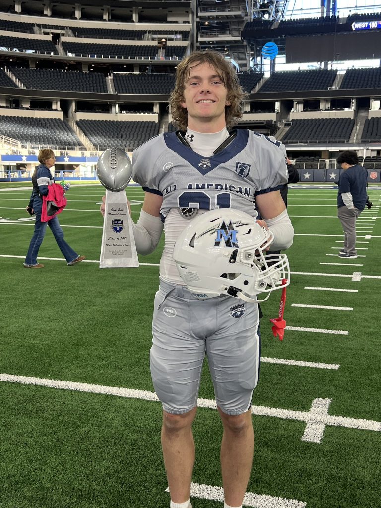 Mica Mountain standout Riley Carson holds the Defensive MVP trophy of the Blue-Grey All-American Bowl held at Arlington, Texas, on Monday (Carson photo)
