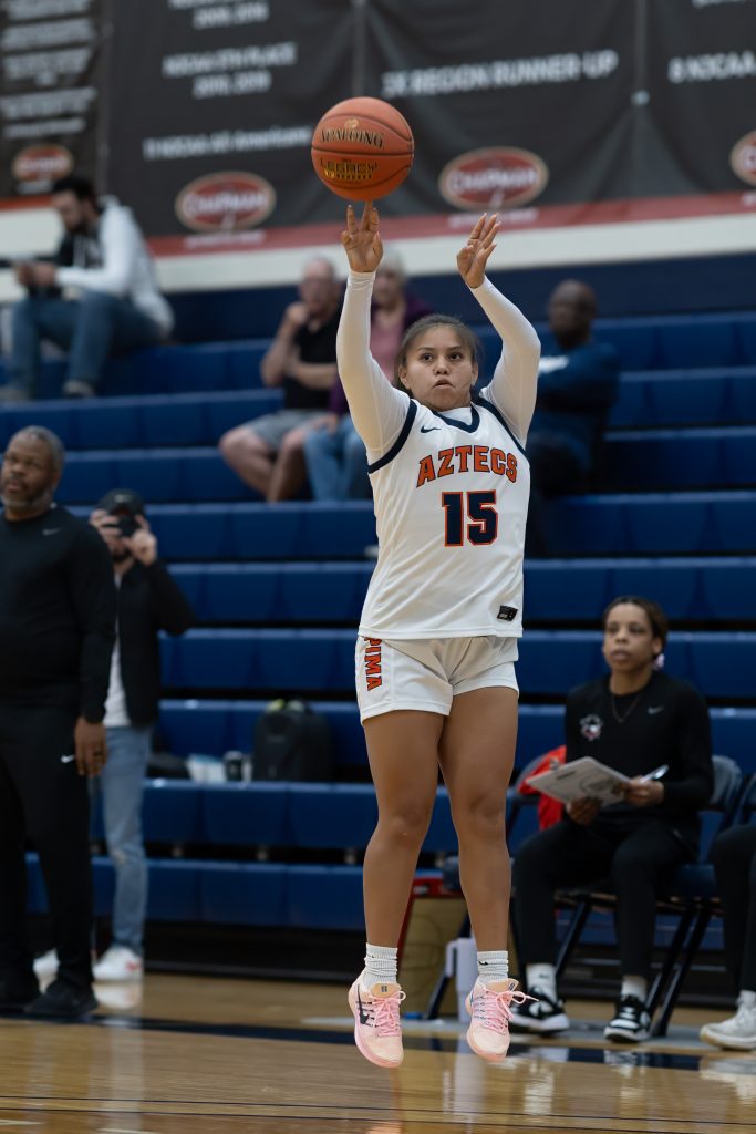 Pima sophomore Ahdiayh Chee was a flawless 3 for 3 from the field, 3 for 3 from three-point range and 2 for 2 from the foul line as she score nine of her 11 points in the second half in the Aztecs win over Phoenix College (Stephanie van Latum/AllSportsTucson.com)