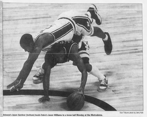April 2, 2001: Though a loss, the championship game was the culmination of a memorable season. Arizona led by 35-33 at halftime, but second-half performances by Duke’s Mike Dunleavy Jr. and Shane Battier proved too much. Woods finished his college career with 22 points and 11 rebounds. Arizona was banged up with Arenas (shoulder) and Walton (broken thumb) not at full strength. Duke’s Jason Williams got away with one of the most infamous non-calls, riding Gardner going after a loose ball, preventing Williams from potentially fouling out.