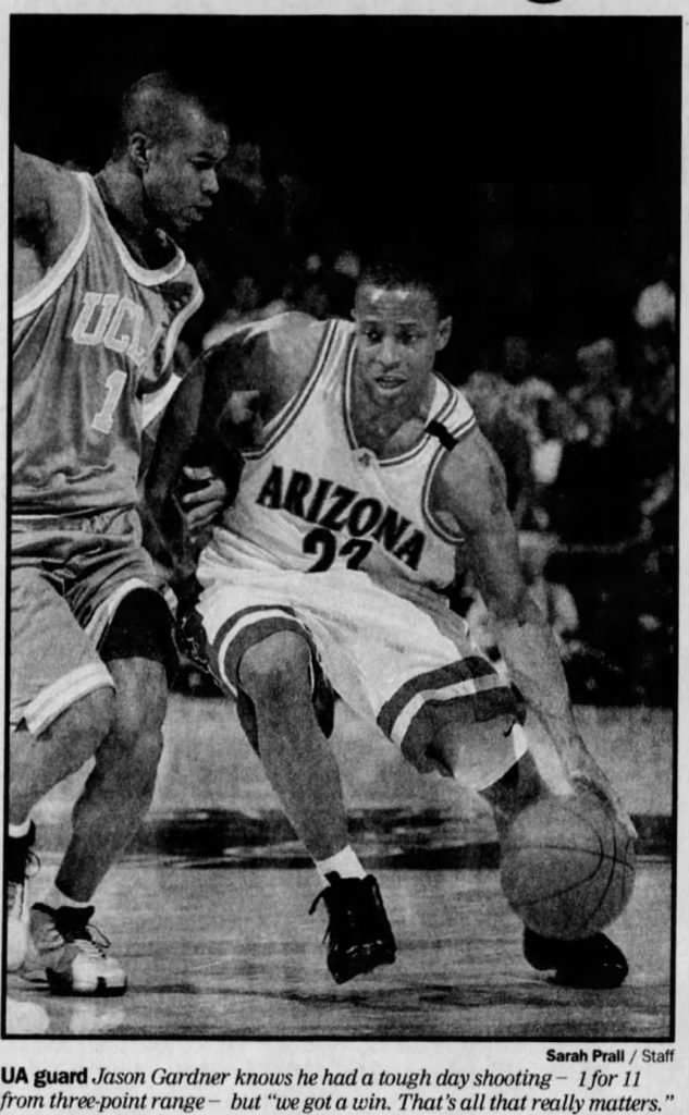 January 20, 2001: One game after Olson’s return to the bench following a three-week leave fulling the passing of Bobbi, the Wildcats hosted their rivals and offered a dominant display. Arizona blew the game open with a 55-point second half, fueled by Arenas and Gardner. Arenas hit 4 of 7 shots from 3-point range and scored a game-high 22 points. Jefferson had 12 points and combined with Walton to smother UCLA’s leading scorer, Jason Kapono, into a 2-of-14 shooting performance.