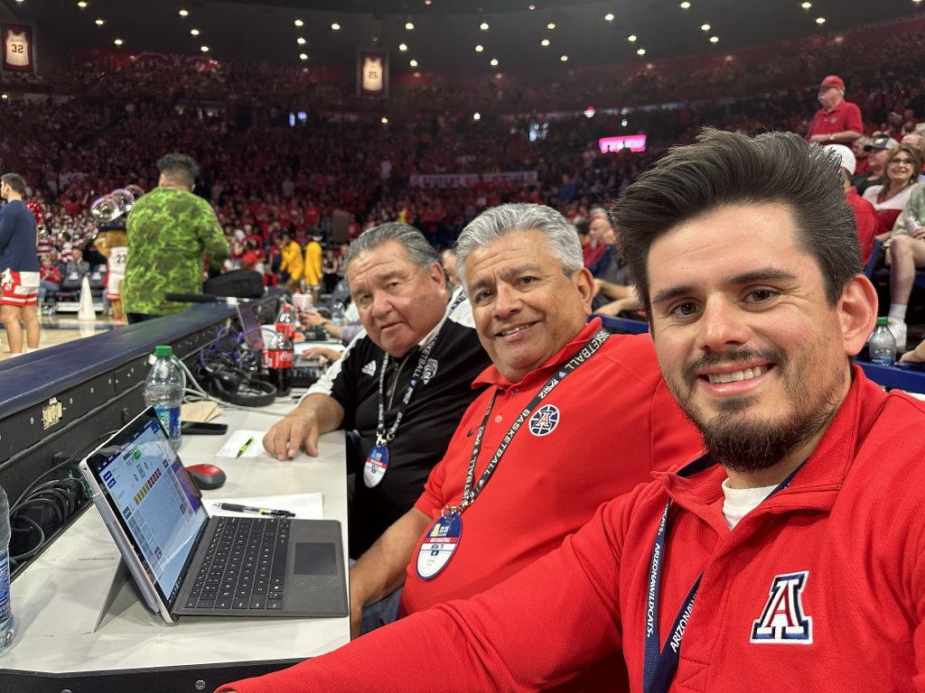 Gene Gonzales (far left), brother Jay and Jay’s son Adam have encountered special tiimes together as part of Arizona’s stat crew at McKale Center (Gonzales photo)